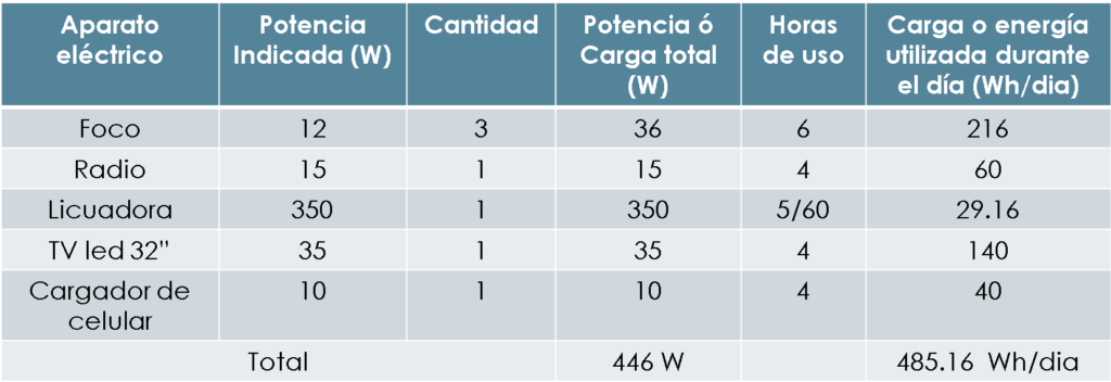 Cuadro de cargas para dimensionar un sistema fotovoltaico autónomo